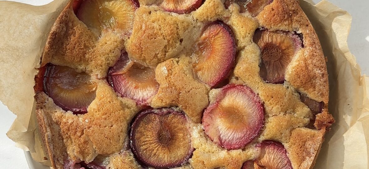 A simple and moist cake, topped with plum halves and sugar for that crunchy sugar topping, this plum cake is quick and easy and perfect for breakfast or with an afternoon coffee.
